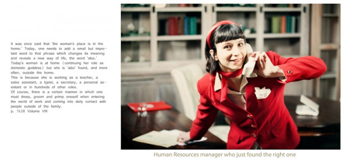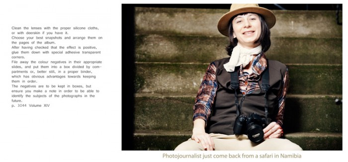 The photography project Donna Caucasica (Caucasian Woman) aims to give a an ironic profile of the modern Western woman by combining each image with an extract taken from 'The Woman's Encyclopaedia', a 20 volume work published in 1963 by Fabbri Editori. Borrowing from the language of stock photography (practically the only type of images featured in magazines), the project traces the stereotypical representation of femininity and, through the use of the self-portrait, gives a nod to the 'profile pic generation.'