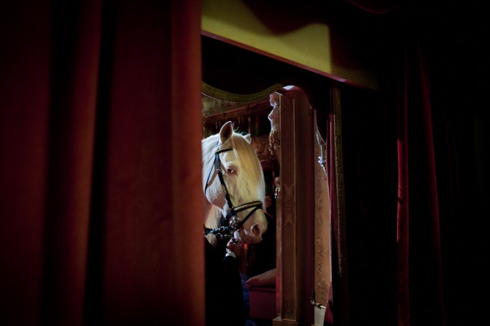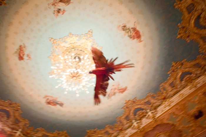 A white horse peeks through the theatre's red curtain and observes the red parrot that flies across flashing lights. Eighteenth century ladies dance to the rhythm of ABBA courted by men in powdered wigs. A music sheet falls from a flying piano and lands on the floor. Flirting eyes, wild dances, the voluntary loss of control and a state of euphoria are the result of the disinhibition provoked by a simple mask.
