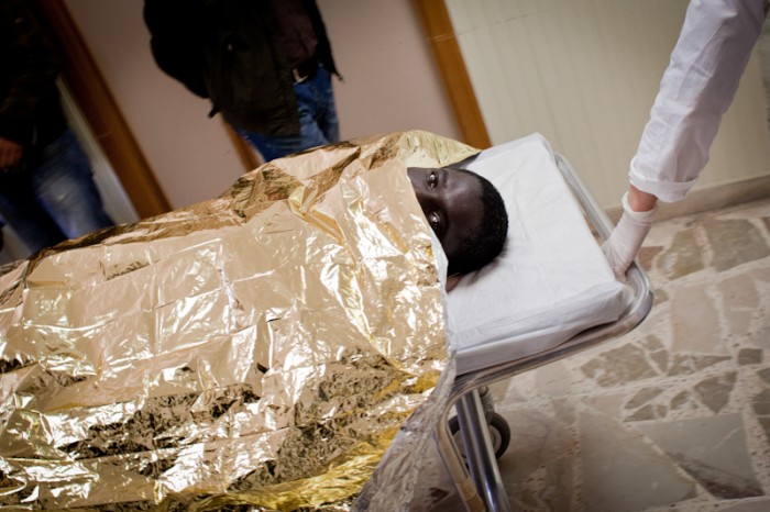 Lampedusa, Italy. 6 April, 2011. A migrant suffering hypothermia after the shipwreck is under medical control and warmed up in the Lampedusa hospital on April 6, 2011. 47 people have been rescued south of the Italian island of Lampedusa. Italian authorities say 150 people are missing after a boat carrying North African migrants capsized in rough seas near the island.