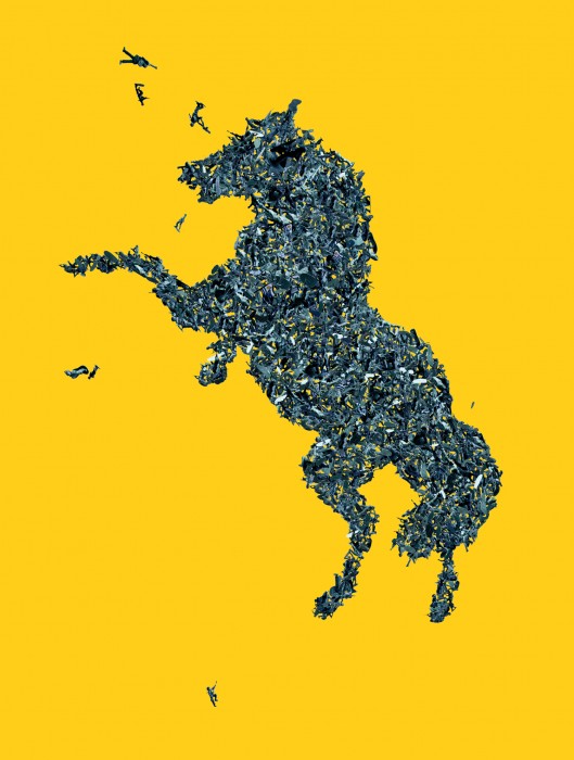 This works using high speed photography to shoot falling down the military model, each background subtraction and collage into the image of the horse.