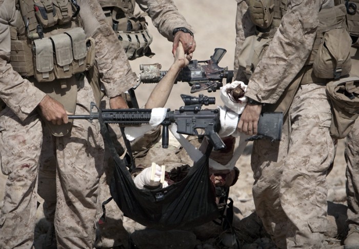 AFGHANISTAN, HELMAND : A severely wounded US Marine hit by an Improvised Explosive Device (IED) is carried by his comrades to a medevac helicopter of U.S. Army's Task Force Lift "Dust Off", Charlie Company 1-171 Aviation Regiment to be airlifted in Helmand province on October 31, 2011. The Marine who hit by an IED lost both his legs and fights for his life. All foreign combat troops will leave Afghanistan by the end of 2014 and will require the Afghan army and police to play an ever-greater role in fighting the Taliban insurgency.
