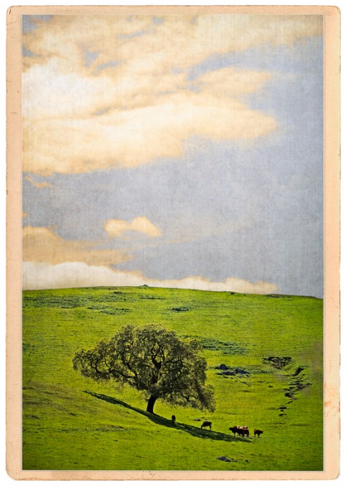 Fine art papers and weathered cards are incorporated into a stylized portrait of grazing pastures, sky and cattle along the Sonoma County line north of San Francisco, California.