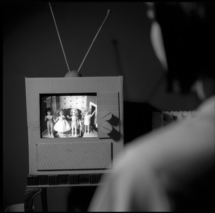 The theatrical sensibility and the use of miniature, staged here on the TV made out of cardboard, is a gateway into a more abstracted description of human experience that brings the representation into a more poetic realm. Time implodes into itself, portraying human experiences as a vertical journey between existential planes. It is presented in a dream state, rather than as a linear timeline existing in our waking conscious life.