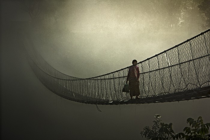 In the early morning, a Nepalese woman crosses the bridge over the Kali Khola River (Batulechaur, Nepal).