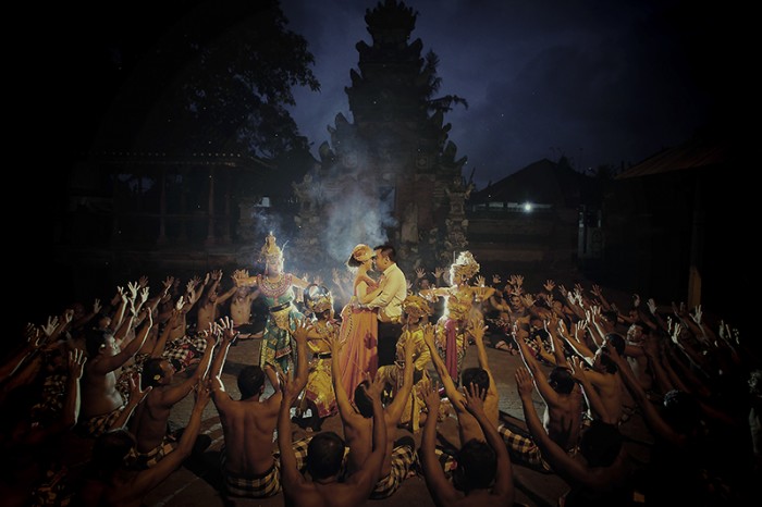 It's a pre wedding session for Indonesian couple, photograph in Bali among Kecak dancers