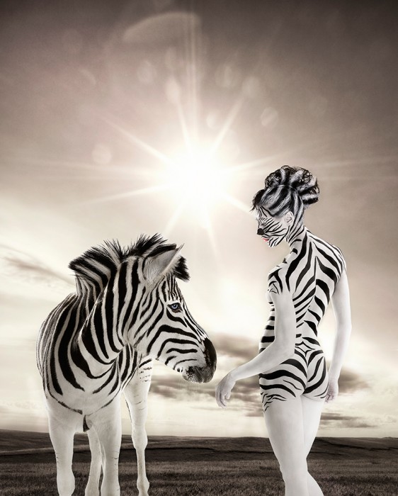 Image is from my ani-human project, used this image to promote my photography. Image with zebra and body painted human zebra is one capture with background added in post.