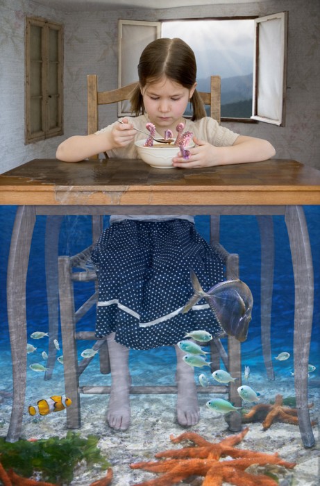 Catherine Rondeau is a fine art photographer, videographer and author. Over the last few years, she has developed an acute interest for surrealism and now specializes in the creation of whimsical dreamlike photo montages that blur the boundaries between fiction and reality. Inspired by her research into the perception of wonderment in folk and fairy tales, she is currently working on a series of images that portray the way children daily use their imagination to go, much like Alice in Wonderland, beyond the looking glass in order to release inner tensions. Tinged with poetry and expressive candor, her dreamlike trompe l'oeil compositions are invitations to dive into the swarming and colorful reverie of a child busy negotiating her place in the world.