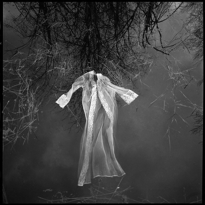 During the "Breakup" period of spring in the interior of Alaska, the snow melt creates standing high water for a short period of time. This high water and mirror reflection ave me the idea of tossing a dress into still waters and photographing the results. The work created has become Floating Dreams.