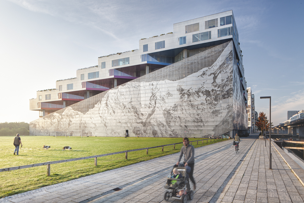 This award-winning building by Bjarke Ingels Group is in the Orestad area of Copenhagen. True to it's name, 'Mountain Dwelling', this large residential design steps up on one side like a mountain, and on the cliff side of the building has a massive 3,000 m² aluminium mural of Mt. Everest.