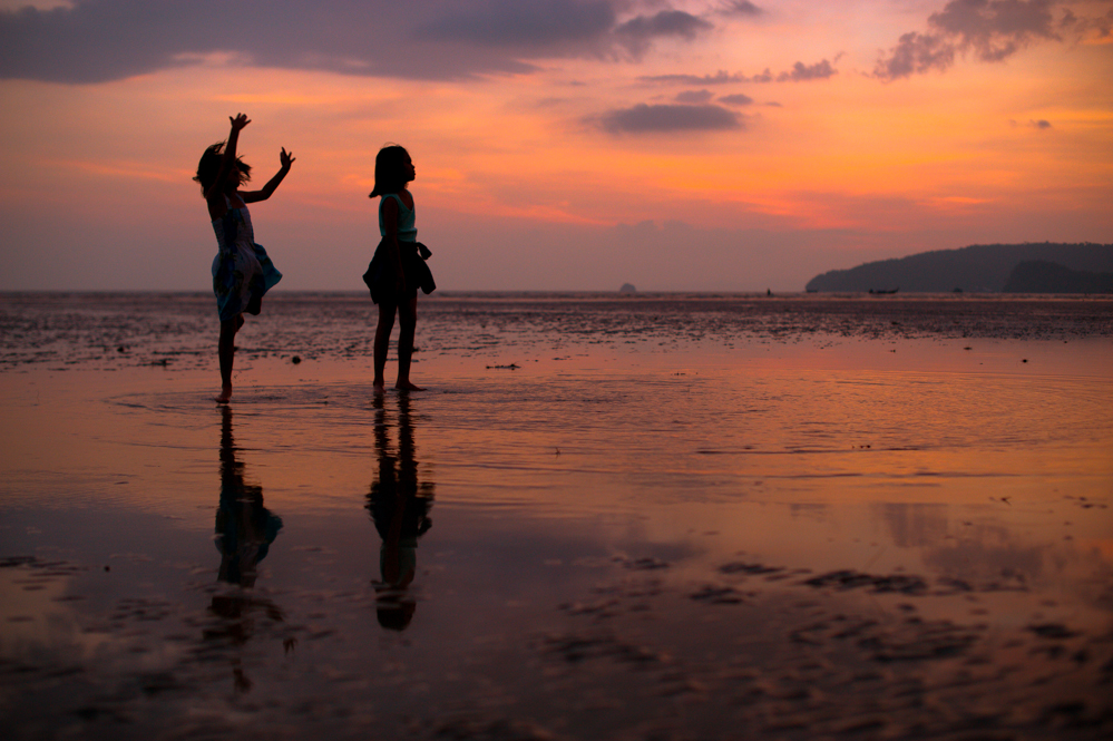 These two friends walking by the low tide of Ao Nang beach, playing with the shallow water while the sun was going down.