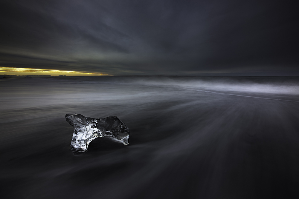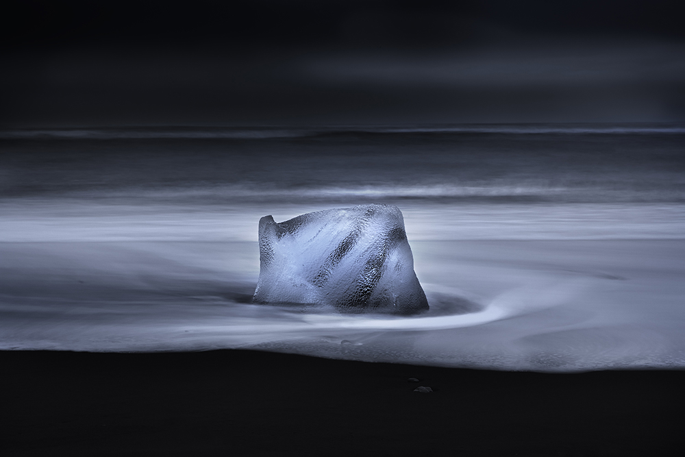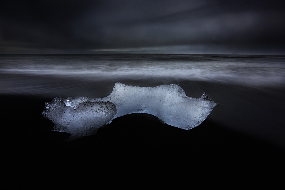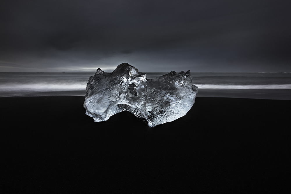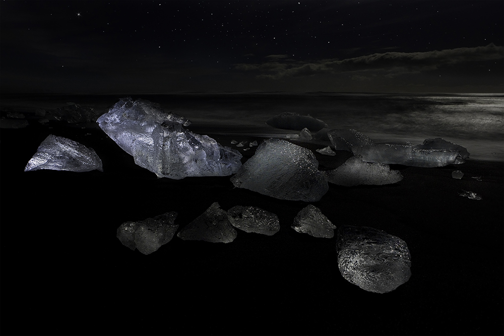 A serie of ice pieces standing on a black sand beach, Iceland.