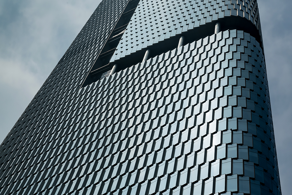 Exterior glass facade detail of the Zifeng Tower in Nanjing, China.