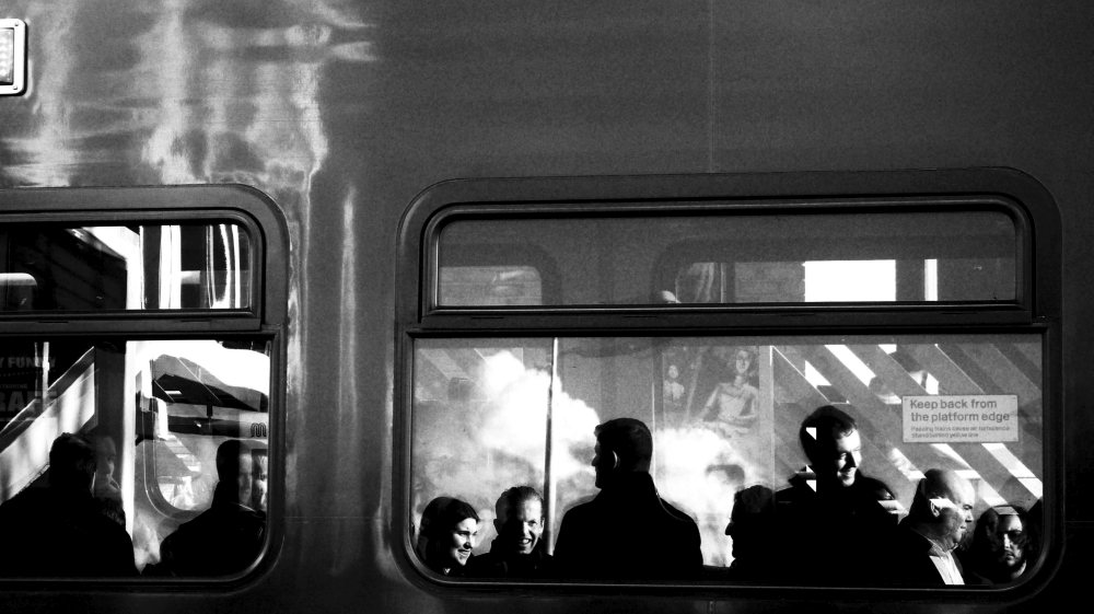 Taken at the end of the day when these people were leaving to get home from work. All the personalities trapped among shadows and scattered in the light.
