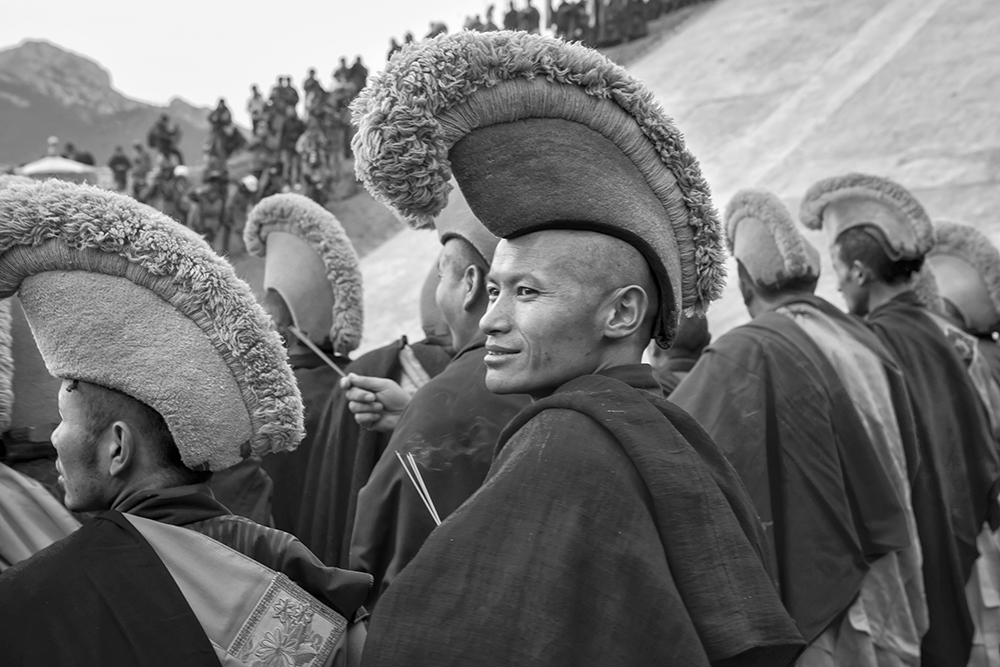 show Lamas wearing their traditional ceremonial hat represent on one side a Lama reunion