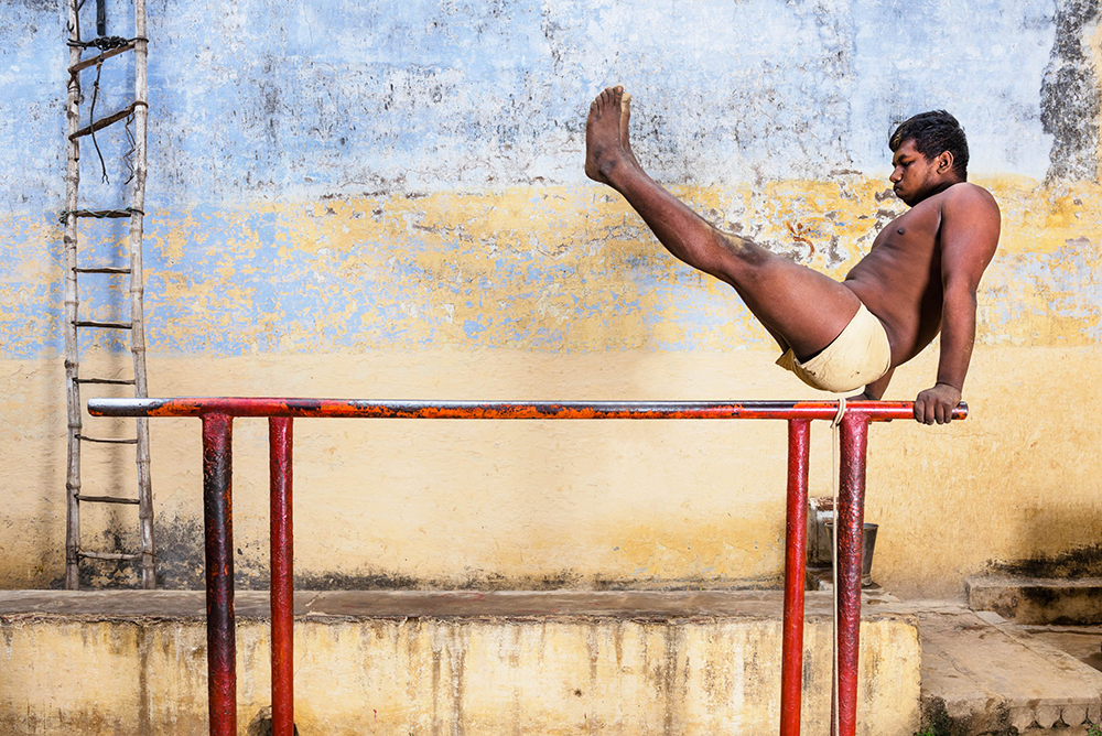 wrestling practiced in India. The wrestlers train by lifting concrete dumballs and neck