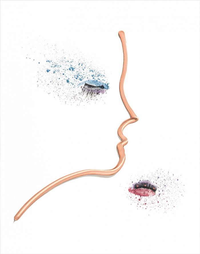 Faces drawn by liquid foundation, make-up powder, and eyelashes