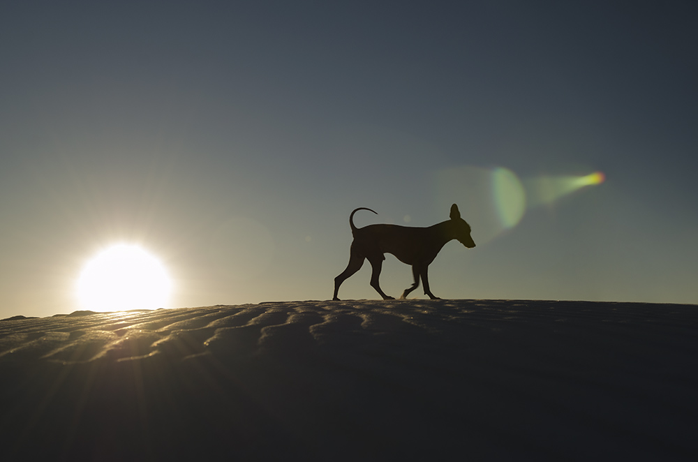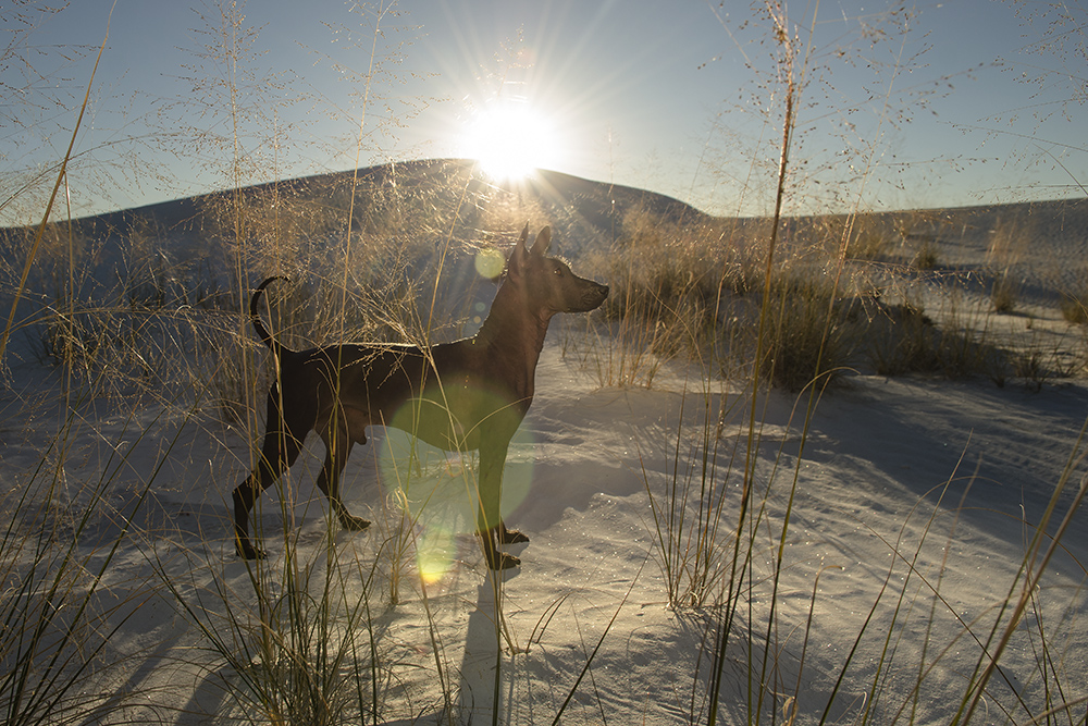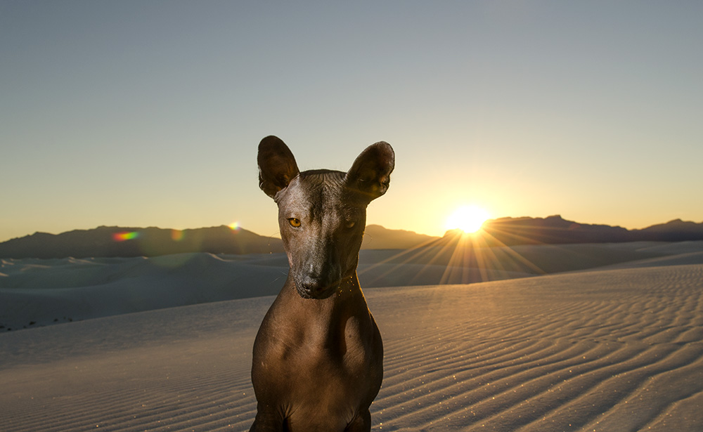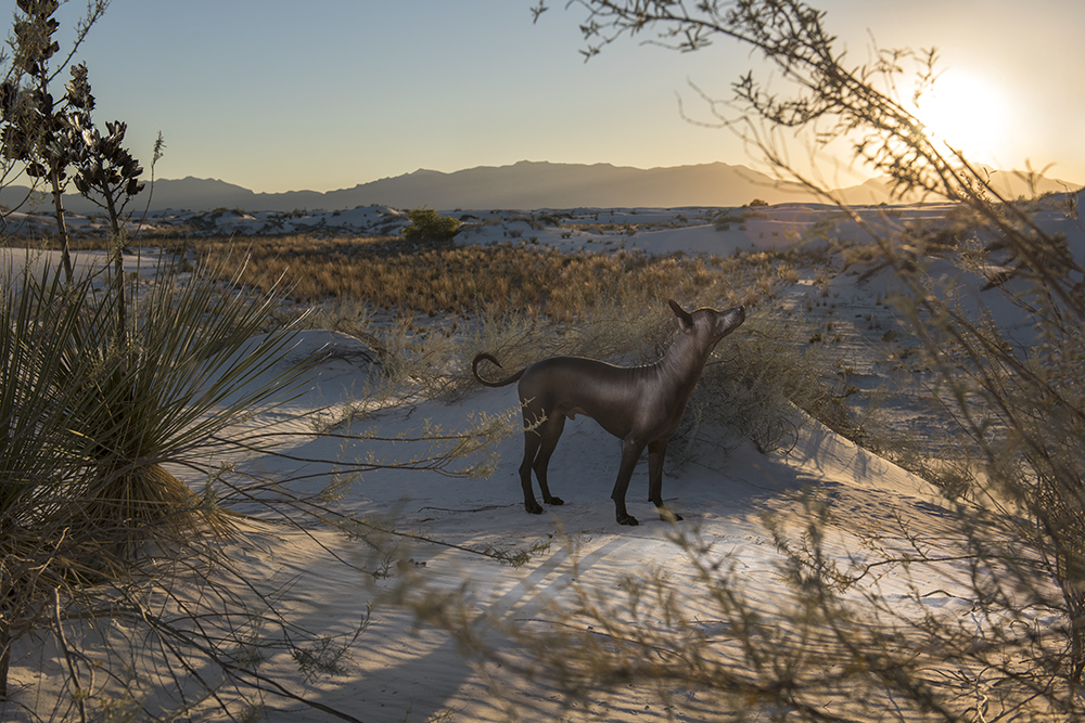 desert at sundown. The Xoloitzcuintli, or Mexican Hairless dog, received his name from the