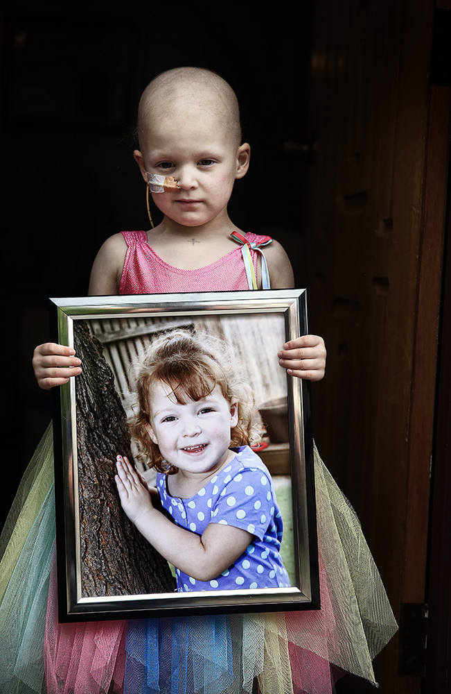 Young Bailey Atkin suffering from cancer and recovering at the Royal Children's Hospital in Melbourne, Australia. Bailey holds an older photograph of herself and remembers happier days.