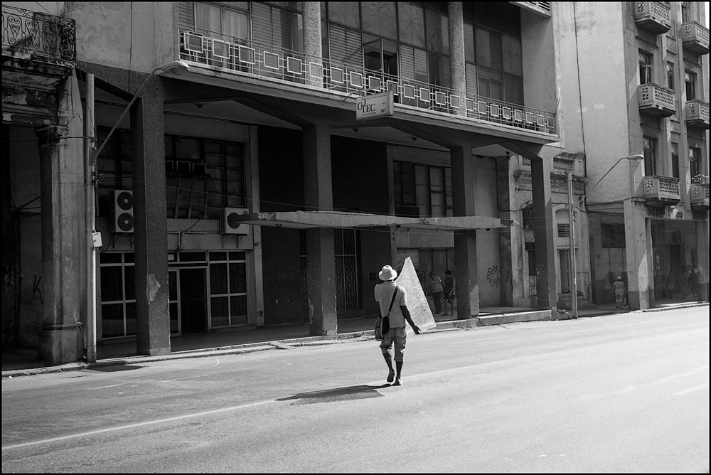 A guy carrying a piece of glass crossing the road in Havana, Cuba