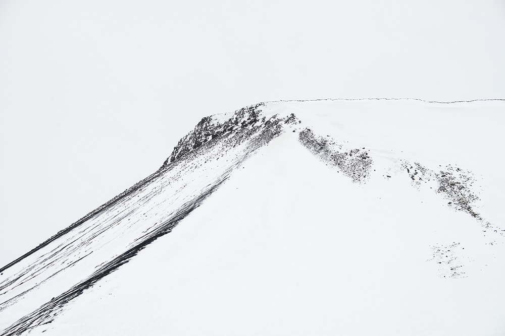 A stark lava mountain in Iceland during a snowstorm.