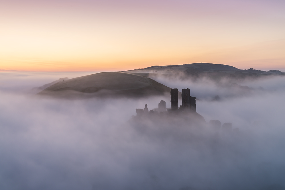The misty Corfe Castle in the early morning at Dorset.