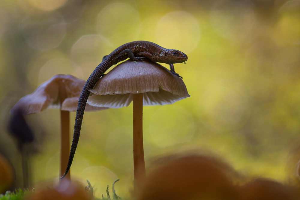 Viviparous lizard (zootoca vivipara) on the mushroom