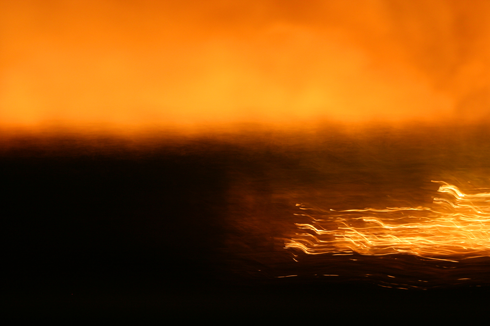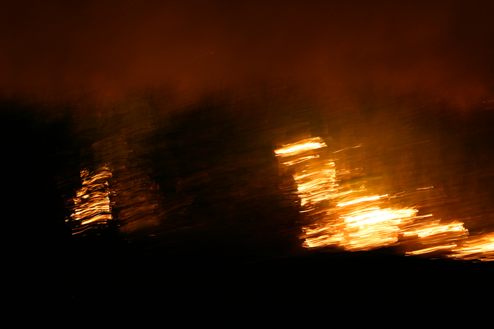 Burning of the sugar cane fields before sunrise (from a moving