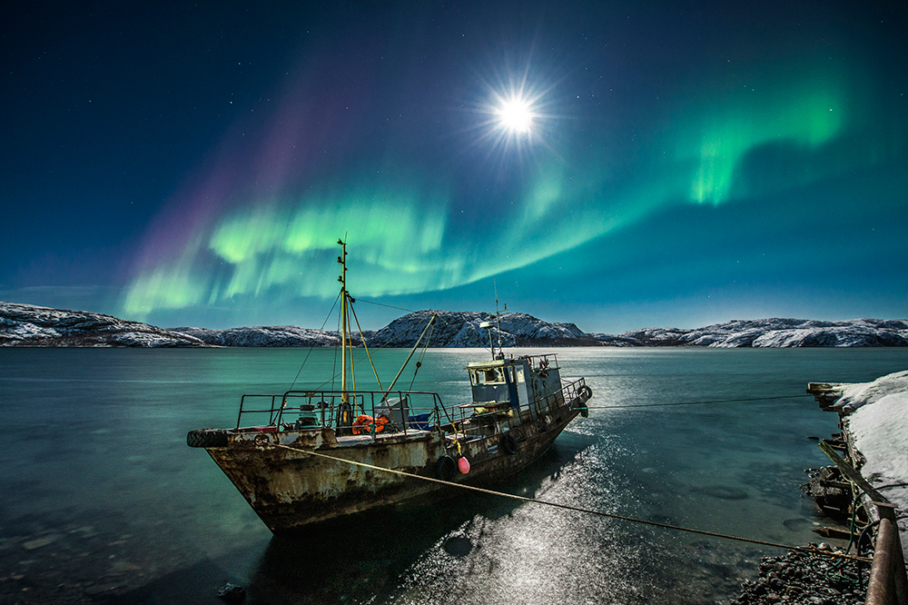 Aurora Borealis in Murmansk region. The combination of beautiful auroras and old fishing ship.