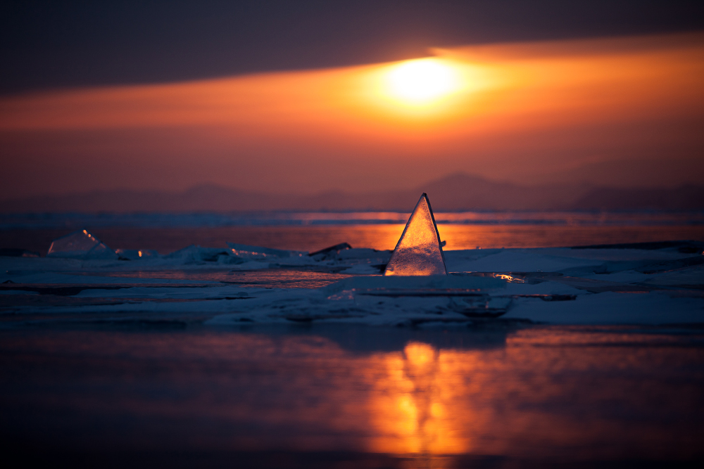 Triangular ice hummock on frozen lake Baikal in winter at sunset.