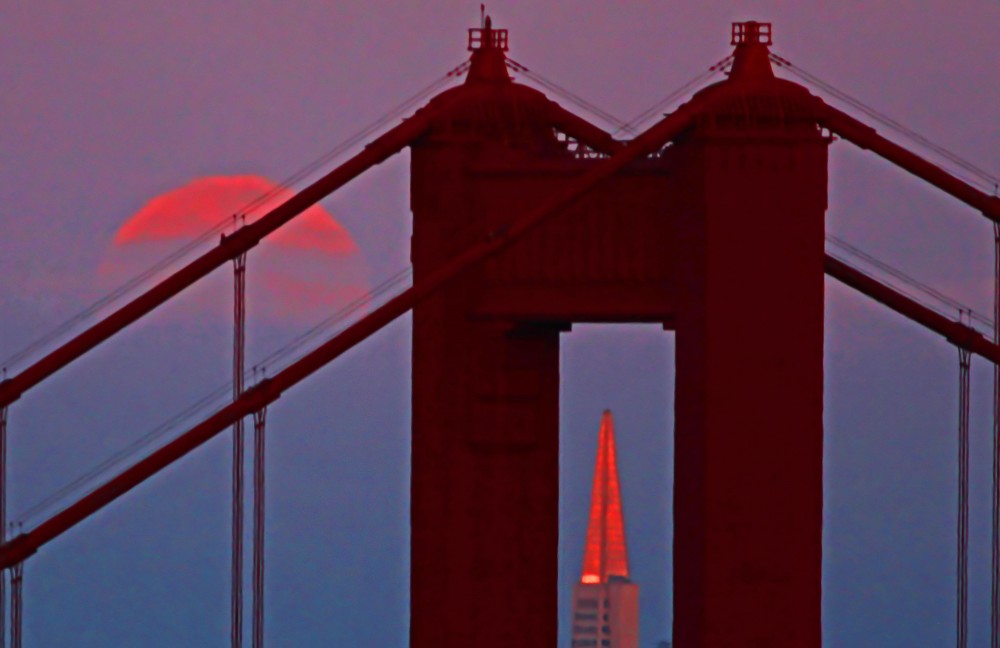 Moon, Transamerica pyramid, and the North Tower of the golden gate