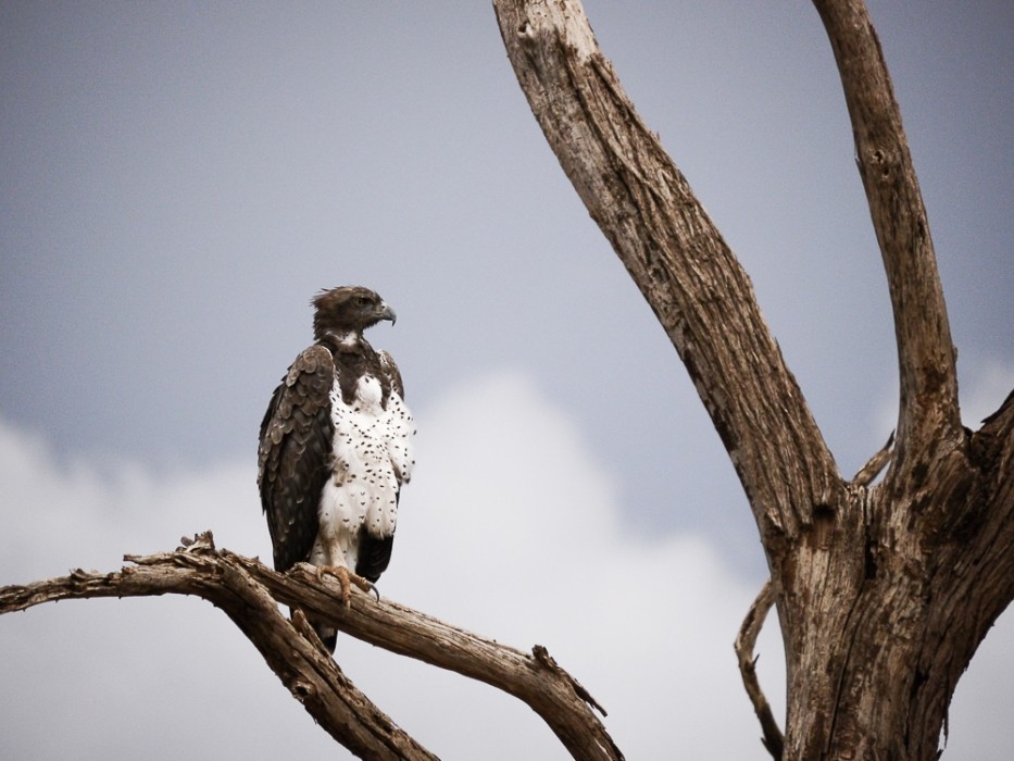 A martial eagle was waiting on the tree, before the thunderstorm in