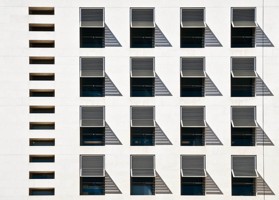 Shadows cast by the "rise soleil" (sun screens) on the facade of a