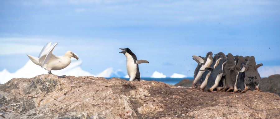 Shot in Antarctica, just when all seemed lost, the adelie penguin mother strode out courageously and faced off the rare all-white southern giant petrel that was cornering the cowering creche of screaming chicks.