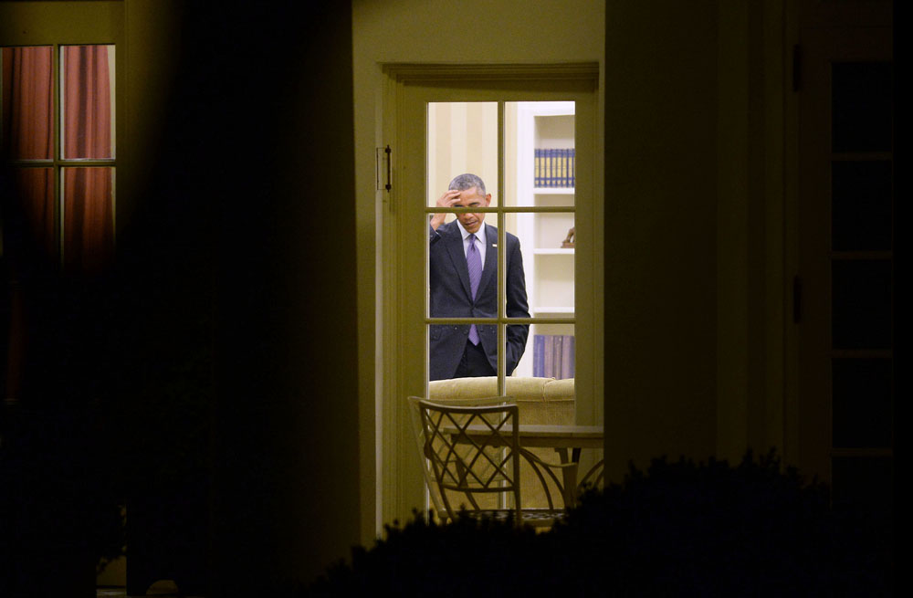 U.S President Barack Obama is seen thru the window of the Oval