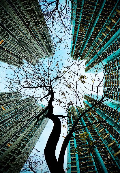 This photo was taken in the public housing estate in Hong Kong, the tree was struggled in the little living space under the high density urban landscape.