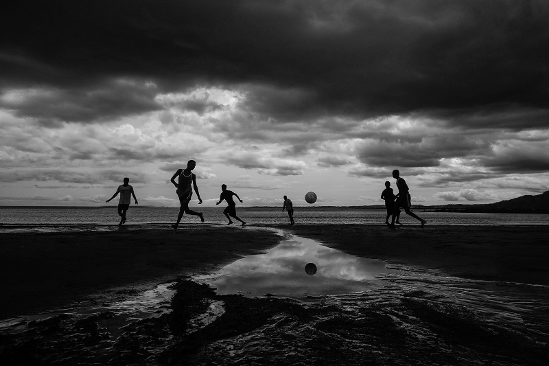 Cuba, Playa los Cocos, a group of boys playing beach soccer