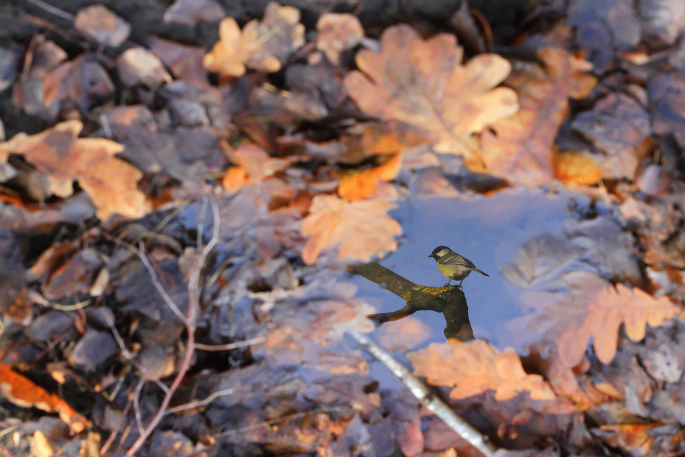 This photograph shows the reflection of great tit in the autumn puddle. Bird seems to be surrounded by the fallen leaves and small branches lying on the ground. I took this photograph in Bydgoszcz (central Poland).