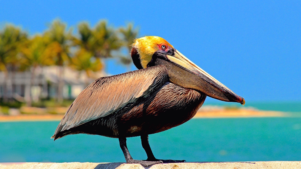 Profile of a standing pelican from Key West, Florida with blue