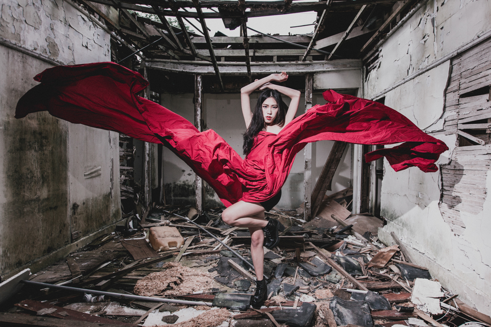 In the ruin in the Y.M Mountain in Taiwan, the girl in red swing the red