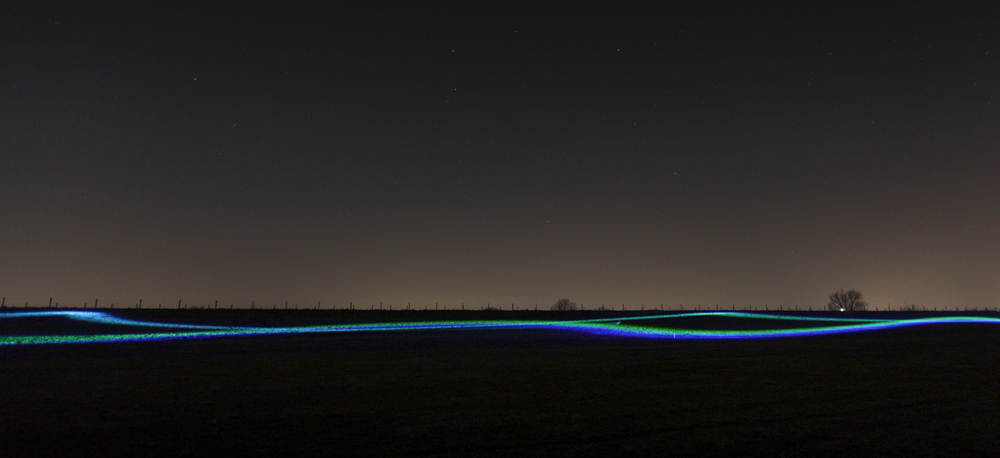 Westervoort (The Netherlands) hosted the world premiere of Waterlight by Daan Roosegaarde. The Northern lights of the Netherlands consists of wavy lines of light across an area of over 4 acres.