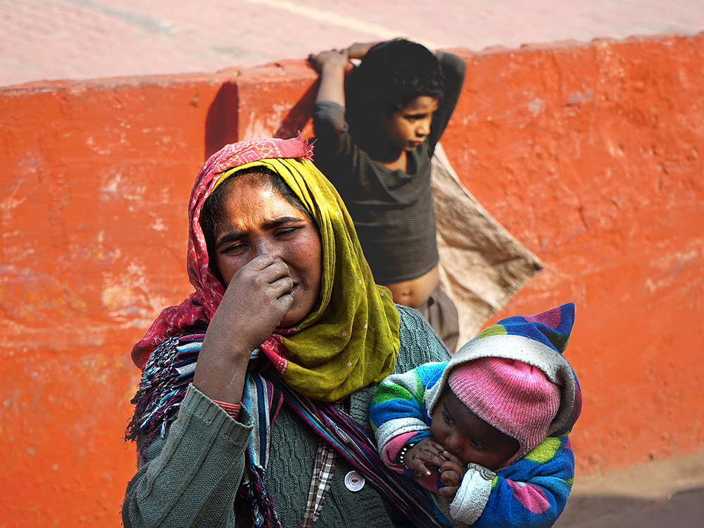 A sad crying mother embrace an ignorant baby,and her son had nothing to do .
