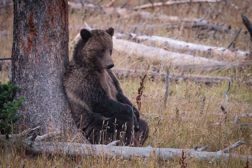 A young female grizzly bear, lost in its thoughts in Yellowstone National Park.