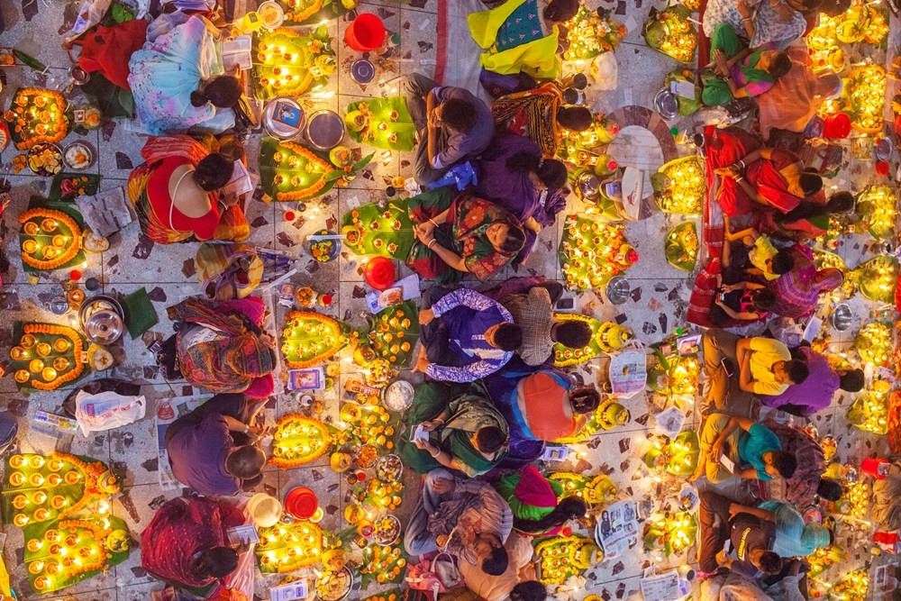 Hindu believers are sitting together on floor in Lokenath Brahmachari