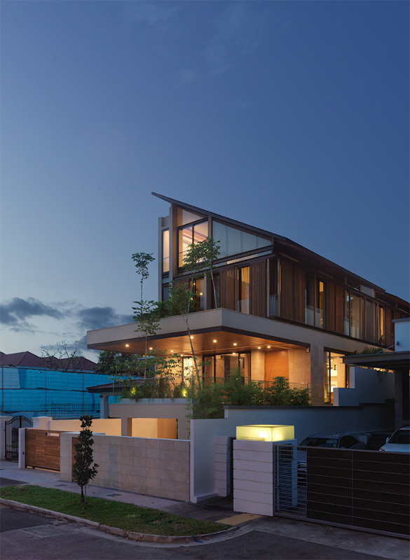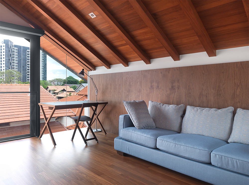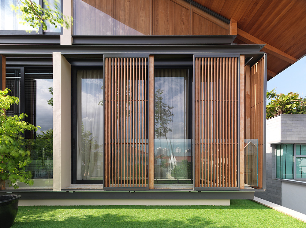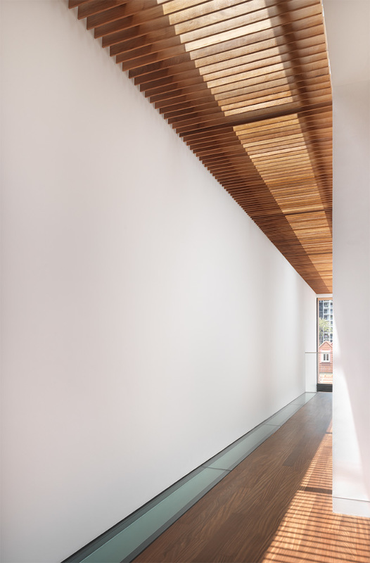 Featuring a wooden screen wrapping around the upper levels, this single family residence resembles a floating cabin over concrete. Wood also plays an essential part in the interior, bringing forth a bold contrast when matched with the brilliant white walls.