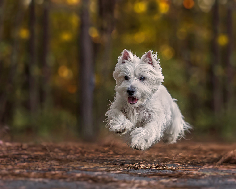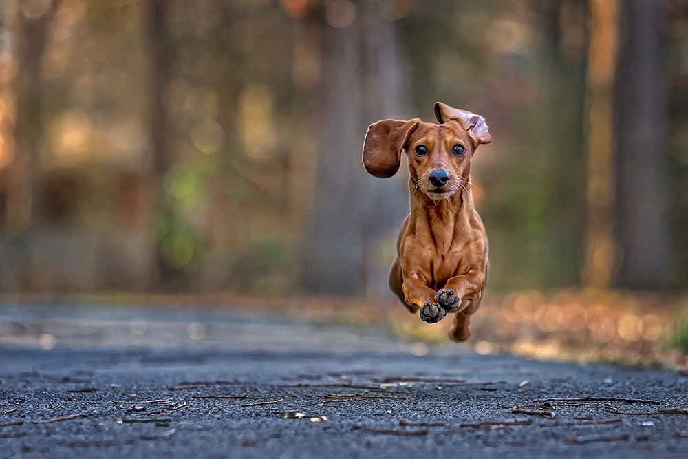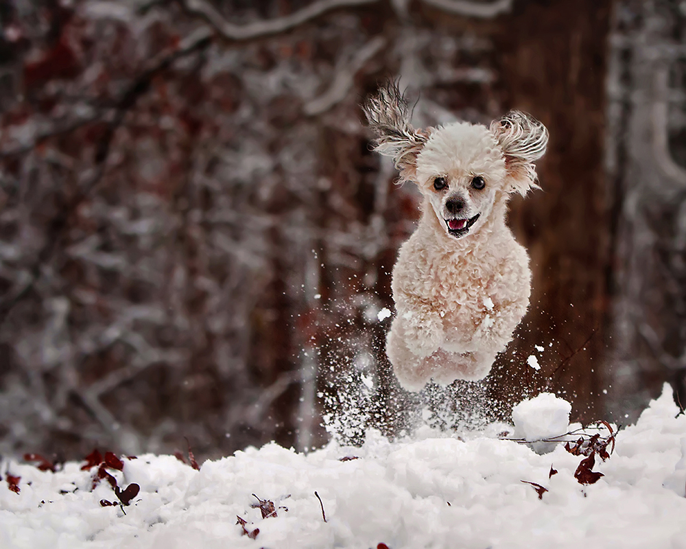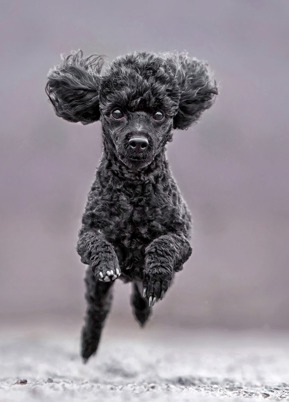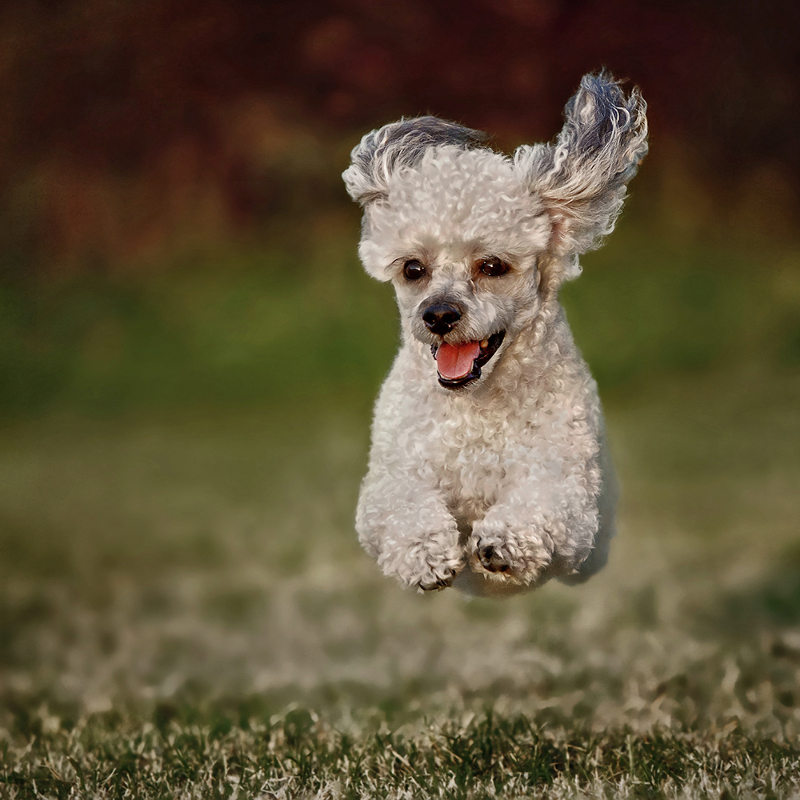 Delightful puppies flying through the air. As a pet photographer, my goal is always to capture an animal's true personality; making him look happy, healthy and like he's having fun. A dog "flying" through the air is a moment of pure delight and happiness.