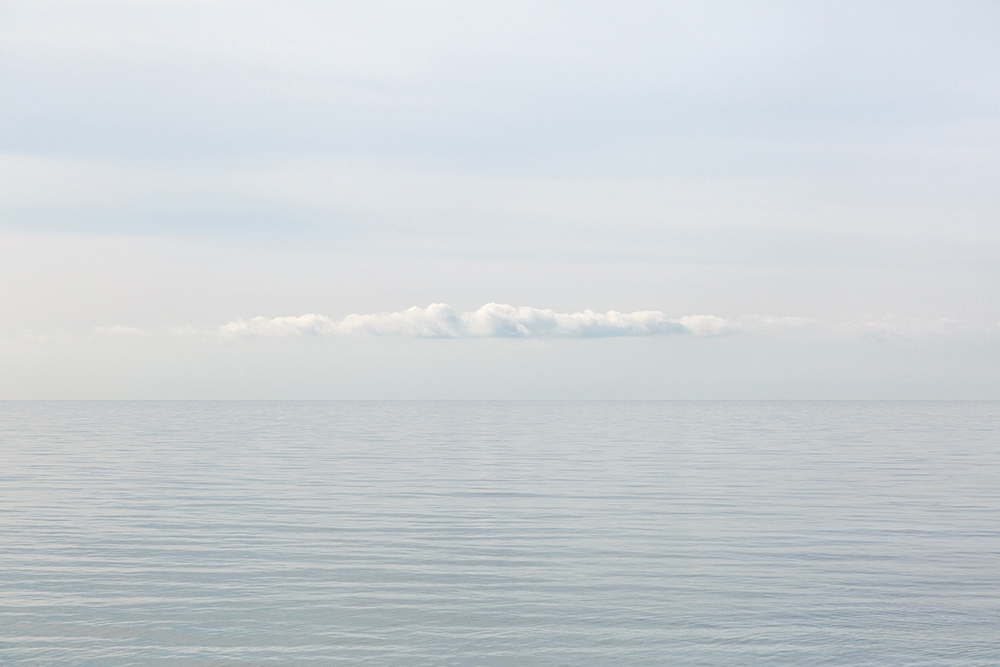 A single cloud floating on the horizon above the calm surface of