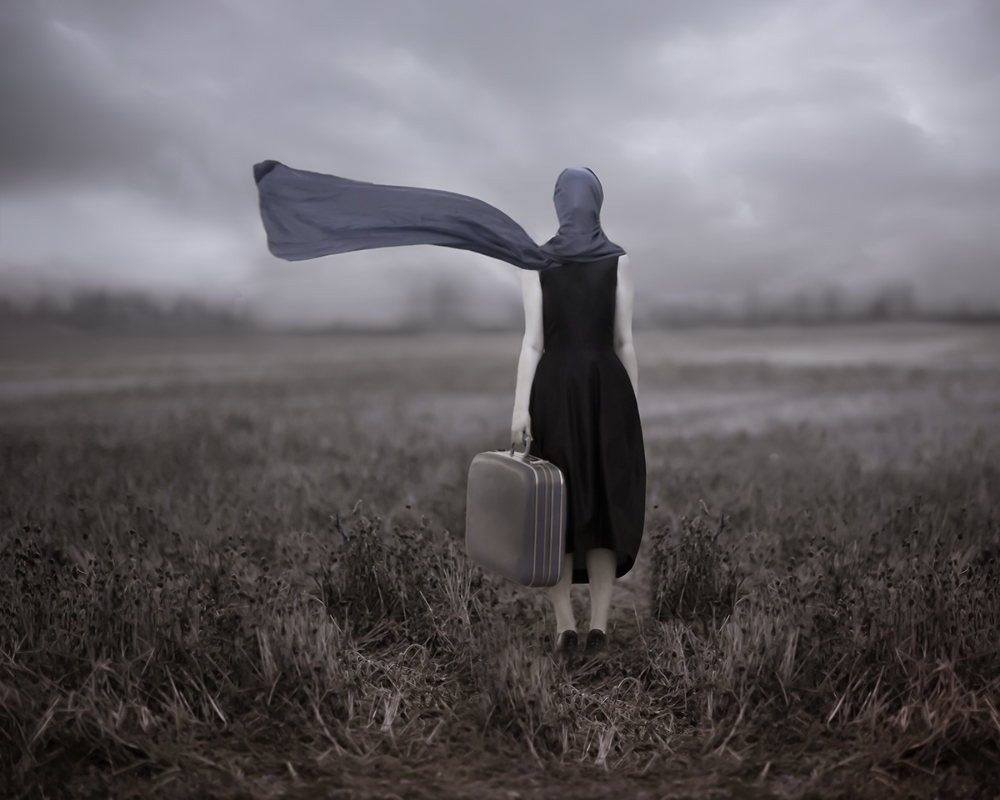 This photo re-imagines the female in Rene Magritte's painting "The Lovers". In this photo she is depicted with suitcase in hand... leaving. The viewer is left to piece together the story of why she is leaving and where she is going as her face is unseen and her