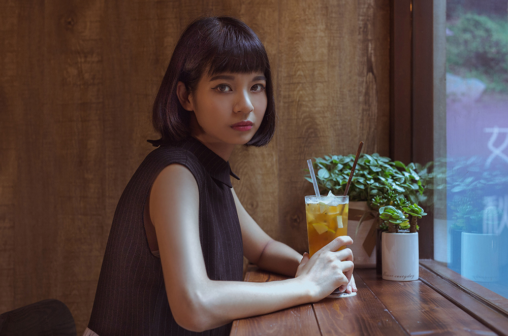 A girl seat near to the window of the coffee shop drinking her fruit tea