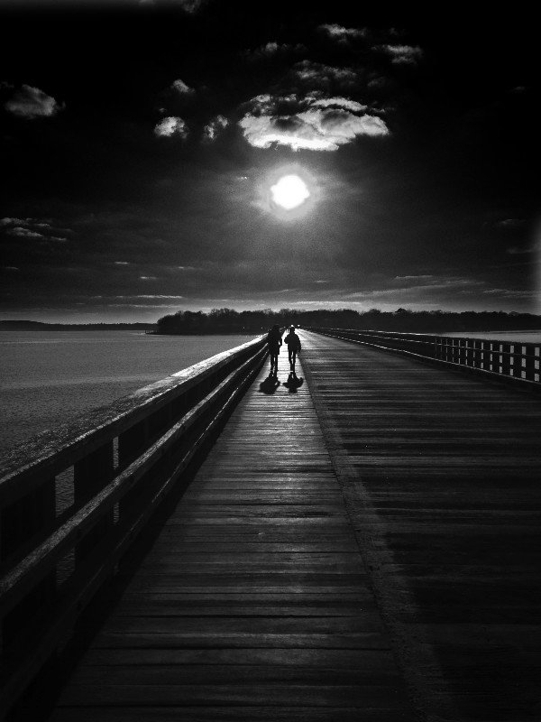 Duxbury Ma a couple crosses over the mile long bridge at sunset