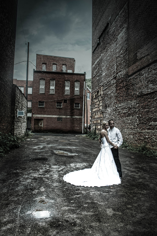 A wedding couple swiftly glances around the city they will now call home. Storm clouds loom in the distance as the dirty brick walls stand as an earthy shield.